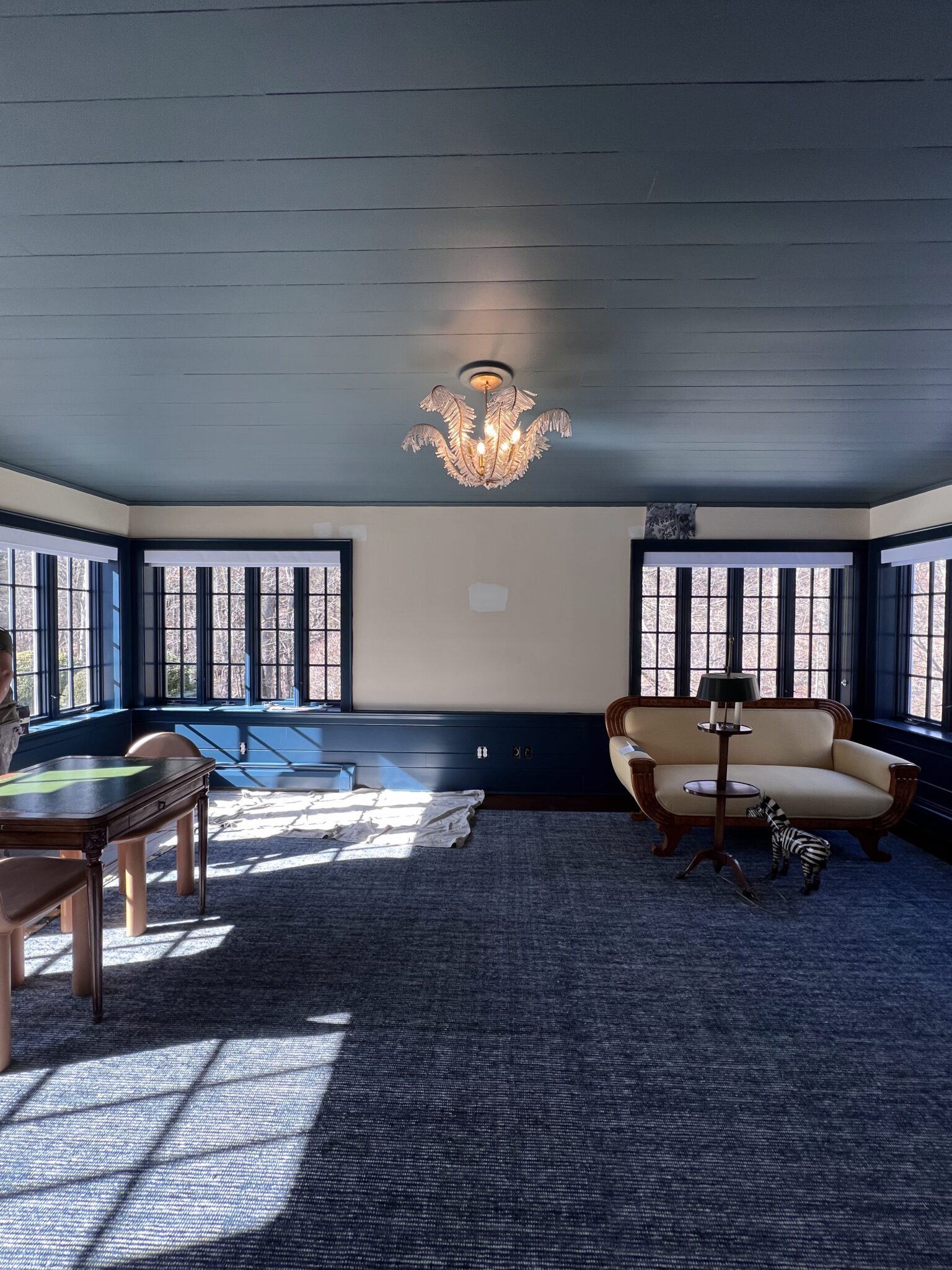 This project was extra special because it was the second time this couple hired us in just five months. They wanted their playroom to have personality while still feeling polished. The deep blue ceiling and trim were their bold design choice, and we were excited to make it happen.